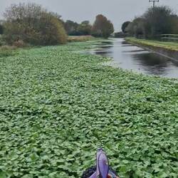 So few boats had passed this way recently that invasive Pennywort had thrived, covering the breadth of the channel in places. Will needed to be very careful because it could easily get caught in Rainboat's propeller, requiring us to stop, open the weed hatch and stick our hands down into the water to untangle it. He did well in this respect, building up momentum then putting the engine into neutral to gluide over the blockages. Unfortunately at one point the weed was so thick that the we ended up grounding ourselves on it and coming to a complete stop. No amount of hard reversing or acceleration would move us so Vicky took to the bow with a sickle and pole, cutting the mess of intertwined roots from the hull, then pushing them further away. Will had another pole at the stern. 20 minutes later we were knackered but free.
