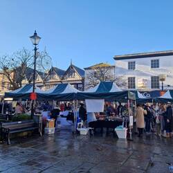 The Maltings wasn't too far from Chorley. The town hosts an indoor market open every day, and on Tuesdays it is joined by an outdoor market. We rode the bikes along a puddle pocked towpath, then up the road leading to the town centre. The place was buzzing with activity despite the drizzle. We enjoyed a low priced lunch of fish'n'chips in a marquee that extended the seating area of a small café.