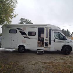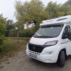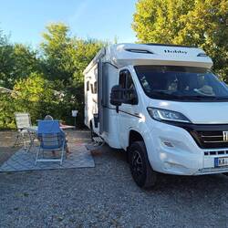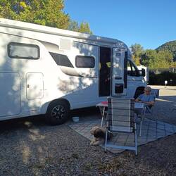 Auf dem Stellplatz eingecheckt, schöne geräumige Plätze, Klappstuhl geeignet und so breit, dass man die Markise Ausfahren kann