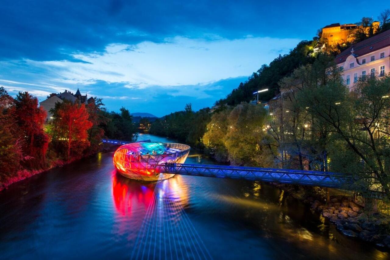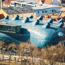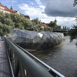 Située au cœur de la cité, entre le Schloßberg et le Kunsthaus et l'un des emblèmes de la ville de Graz, la Murinsel est, à vrai dire, plus une plate-forme émergée qu'une île et, dotée de deux passerelles, elle permet de relier les deux rives de la rivière.