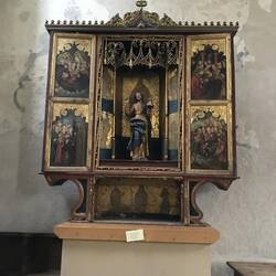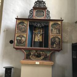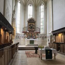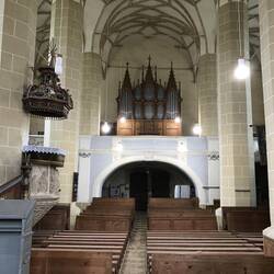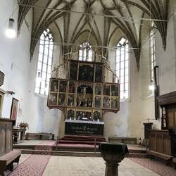 La porte de la sacristie est fameuse, elle aussi, par son système très compliqué de 19 serrures, réalisée par les maîtres locaux, en 1515 et qui a déclenché un intérêt exceptionnel, étant primée à l’Exposition Mondiale de Paris de 1900 et qui constitue un exemple représentatif de la manufacture saxonne médiévale. Le système original de fermeture fonctionne aussi bien de nos jours et il est démontré aux touristes.