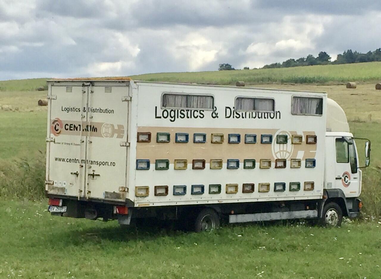 Un camion transportant des ruches pour la polinisation avec les couchages en haut pour le(s) propriétaire(s).