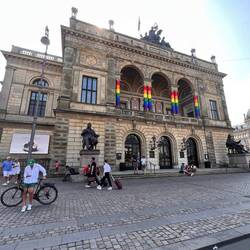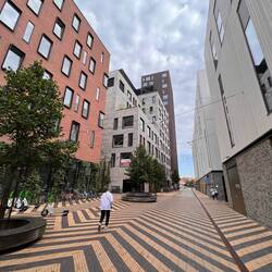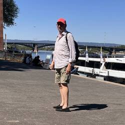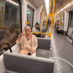 Départ en tram numéro deux pour visiter la ville de Brunswick. Il fait relativement chaud, Lucia a pris une canne car elle a un peu mal à son genou.