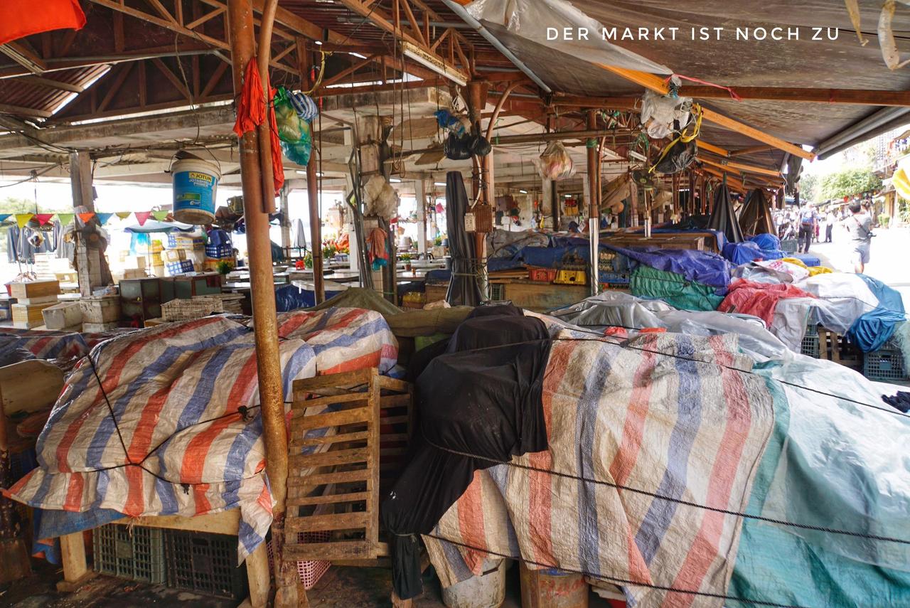 Das klingt gut und nach einer erfrischenden Dusche schauen wir uns das an. Wir merken gleich, hier ist es irgendwie anders als in den bisherigen Orten. Der große Marktplatz ist wegen Neujahr verwaist, uns ist das sehr angenehm! Auch hält sich der übliche Trubel in Grenzen - das wird sich später ins Gegenteil verändern und am Abend ist der kleine Ort dann richtig voll! Ist aber nicht so stressig, weil hier auch der Vietnamese mal laufen muss 😉!