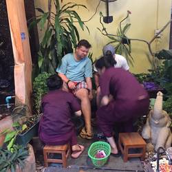 Unser Fahrer hat ausgeschlafen und so fahren wir schnurstracks ins Hotel, trinken Kaffee und machen uns dann auf den Weg zur 1stündigen Nacken-, Schulter- und Rückenmassage (200 THB = 5,40€). DasRead more