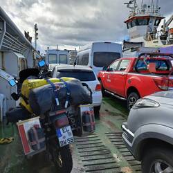 Bei der Ankunft am Abend war mir aufgefallen das dort einige Wohnmobile standen. Es war eine Gruppe Deutsche. Aber auch ein Tscheche, ein Paar aus Groningen, Captain America, und aus fast jedem südamerikanischen Land war jemand vertreten. Am Morgen unterhielt ich mich mit einem der Deutschen. Man fuhr die Panamericana-Route. Alaska bis Panama war bereits geschafft. Jetzt von Kolumbien bis Ushuaia. Übermorgen geht es nach Haus. Eine Familie war auch dabei. Die Kellys. Wir sprechen über Pannen, über das Land und die Menschen. Die Lage in Peru und das es nicht ganz einfach war zurzeit dort durchzureisen. Über eine Pinguinkolonie die man besucht hatte. Er hatte mein Motorrad gesehen und wusste nicht genau wofür EL steht. Er ist beruflich Hier und arbeitet für RTL 2. Seit 20 Jahren begleitet er Joey Kelly. Erst jetzt begreife ich, dass er die Kellyfamily meint und eine Doku gedreht wird. Für eine 40 jährige Anhalterin war ein Traum in Erfüllung gegangen als man sie mitnahm und die Kellys kennenlernte. Ende Mai läuft dann ein Bericht über die Panamericana-Route. Ich mache mich abreisebereit und dabei läuft Joey mir über den Weg. Auch er erzählt mir über das Erlebnis mir einer Pinguinkolonie. Ehrlich, hätte man es mir nicht gesagt wäre er mir nicht aufgefallen. Und genauso zwanglos war die Unterhaltung. Na klar, Foto muss sein. Verabschiedung von den anderen Bikern und auf geht's. Man hat gerade die Kamera gezückt für ein Kellyinterview und grüßt zum Abschied trotzdem. Noch schnell in die Stadt. Geld tauschen bei WU. Aber es ist zu früh, kein Geld. Zum tanken reicht mein Bargeld noch. Da steht der ganze Wohnmobilkonvoi. Der Kellybegleiter muss auch lachen. Es ist trocken und ein eiskalter Wind begleitet mich den ganzen Tag. In Schräglage geht es zur Grenze. Argentinien abmelden,in Chile anmelden. Diesmal digital. Ich bekomme kein Formular. Es herrscht Hochbetrieb. Busse müssen abgefertigt werden. Das wlan langsamer als ein Modem. Es bricht zusammen. Also doch Papierformular. Diesmal keine Gepäckkontrolle. Und weiter zur Fähre. Der Wind wird heftiger und immer mehr Schräglage. Landschaftlich keine wirklichen Höhepunkte. Ich mag auch nicht die Hände von den Heizgriffen nehmen. Das Verkehrsschild zeigt einen Baum. Es ist der einzige in dieser Gegend. Dafür zum Glück nur Asphaltstraße. Als ich ankomme ist die Fähre bereits da. Ziemlicher Wellengang. Doch Blue steht. Das Wasser schwappt sogar über die hohen Seitenwände. Runter von der Fähre und weiter zur nächsten Grenze. Alle Grenzbeamten sind freundlich und hilfsbereit. Und weil ich nix spanisch versteh fragt auch keiner. Argentinien begrüßt mich mit einem Regenbogen. Heute möchte ich es bis Rio Gallegos schaffen. Dort gibt es WU. Ich habe kaum noch Bargeld. Als ich ankomme und den 4. WU ansteuere erklärt man mir endlich, daß es heute in der ganzen Stadt ein Systemausfall gibt. Nix Bargeld. Mist. Der Wind ist immer noch stark und jedem ist kalt. Mir auch. Ich versuch es in einem Hotel, ausgebucht. Dafür finde ich ein Hostel. Blue steht save, und ein 5-Bettzimmer für mich alleine. Sauberes Badezimmer und ne nette Omi die mir noch ein Kaffee macht. Dafür nimmt sie meine letzten großen Scheine. Ich hoffe, dass morgen das System von Western Union wieder funktioniert. Ich hab ne warme Bude und es zieht nicht. Gute Nacht.Okumaya devam et