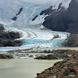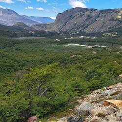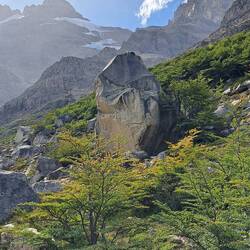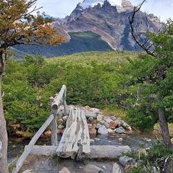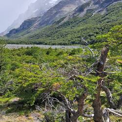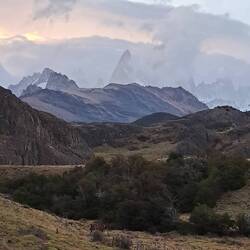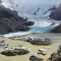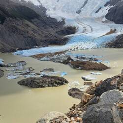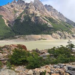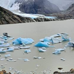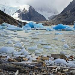 Es war windig aber trocken geblieben diese Nacht und meine Überlegungen nochmal zu verlängern lagen leicht vorn. Das Vorhaben sehr, sehr früh am Morgen aufzustehen um bei Sonnenaufgang in der Nähe des Berges zu sein scheiterten am Trägheitsmoment. Also an der Trägheit in dem Moment und an der Schwerkraft der Masse im unpassenden Zeitquadranten aufstehen zu wollen. Es reichte aber um kurz vor Sonnenaufgang aufzustehen. So war die wichtige Versorgung des Körpers mit ausreichender Energie gesichert bei einem entspannten Frühstück. Scheiterte meine weiterreise gestern am schlechten Wetter so scheiterte sie heute am guten Wetter. Es war zwar leicht windig aber trocken und sonnig und vorweg, diesmal blieb es auch so. Das Handy benötigte ebenfalls seinen Energievorrat. Und sogar die Internetverbindung war kooperationsbereit. So blieb noch etwas Zeit um mit Achim zu reden. Bei der Abgabe der Maschinen schien er der einzige zu sein der bedauerte abreisen zu müssen. Einer wurde überfallen und wollte nach 2 Wochen wieder nach Hause. Ein Pärchen wollte nur noch nach Hause. Also ich bleibe hier. Ein Vorteil als Alleinreisender ist, dass man spontane Entscheidungen treffen kann und kein Zeitdruck hat. Der Aufstieg zum Berg war wieder zu Fuß zu erreichen. Der gesamte Weg war einfach. 9 KM laut Schild aber bis zum Schild waren es auch nochmal 1 KM. Wieder ging es durch Wälder, Labyrinthe über Bücken und immer die Berge im Blick. Verschiedene Mirradore. Es machte einfach Spaß. Und allmählich gaben die Wolken den Gipfel frei. Auffällig war an diesem Tag das viele nicht grüssten oder zurück grüssten. Waren hier soviele Deutsche unterwegs? Und dann der letzte Anstieg über die Kuppe. Ich höre mich selber WOW sagen, als ich die ersten blauen Gletschereisbrocken sehe. Welch ein Anblick und der Gletscher im Hintergrund. Dieser Anblick war überwältigenden als am Fitz Roy. Ganz klar. Ich bat Anna, eine Ingenieurin aus Darmstadt mich zu fotografieren. Nebenbei erzählte Sie mir, dass gefühlt die Hälfte hier aus Deutschland kommt. Aha, alles klar. Über den Seitenkamm mit Felsbrocken brauchte es noch einmal 1 Stunde bis zum Ende des Pfades um den Gletscher in voller Pracht zu sehen. Beste Gelegenheit die Energiespeicher wieder aufzufüllen und dabei den Ausblick zu genießen. Nach 4 Stunden Rückweg war es schon Abend geworden. Eine absolut lohnenswerte Tour. Zum Glück hatte mein Bauchgefühl mal wieder die richtige Entscheidung getroffen. Ich hoffe das Wetter lässt es zu um morgen meine Reise fortzusetzen.Lue lisää