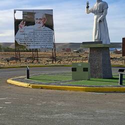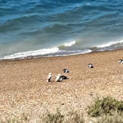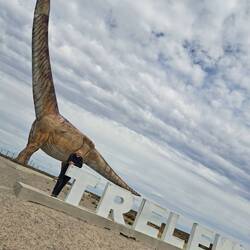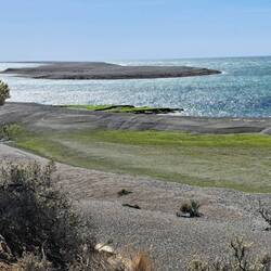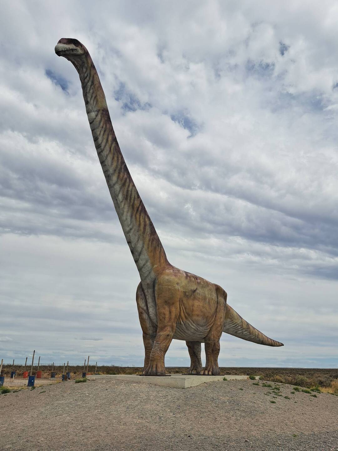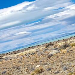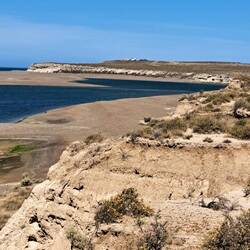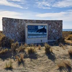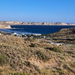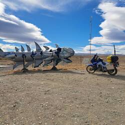 Noch bin ich unschlüssig ob ich noch eine Nacht hier zelten soll, beschließe dann aber doch zu packen. Mein Ziel ist Punta Ninfas am äußersten Zipfel der Küste. Zunächst statte ich aber Dino einen Besuch ab. Die Nachbildung des Patagotitan Mayorum, wie es genannt wird ist 40 Meter lang, 20 Meter hoch und wiegt 16 Tonnen. Das Wahrzeichen von Trelew und die Nachbildung des größten Dinosauriers der Welt an der RUTA 3. Die Fahrt zu Puerta Ninfas führt über Ripio. Nach einem Kilometer ist Schluß, umdrehen. Fast nur Tiefschotterbett mit dicken unbefestigten Schotter. Nein danke, verzichte. Dann lieber über die RUTA 3 nach Puerto Madryn. Der Strand dort ist wie leergefegt. Eine Fahrt entlang der Strandpromenade und Industriegebiet. Flügel von Vesta Windräder sind hier gelagert. Jetzt aber raus aus der Stadt. Bevor ich weiterfahre hält ein Auto und fragt woher ich komme. Er bekundet einfach nur wie gut Blue ihm gefällt. Auch auf der Ruta 3 überholt ein Transporter. Hupt, winkt und Daumen hoch. Positives Feedback für Blue ist keine Seltenheit. In Argentinien schon mehr als in Chile. Oder eigene Besitzer die mir stolz ihre Bilder der eigenen Transalp zeigen.