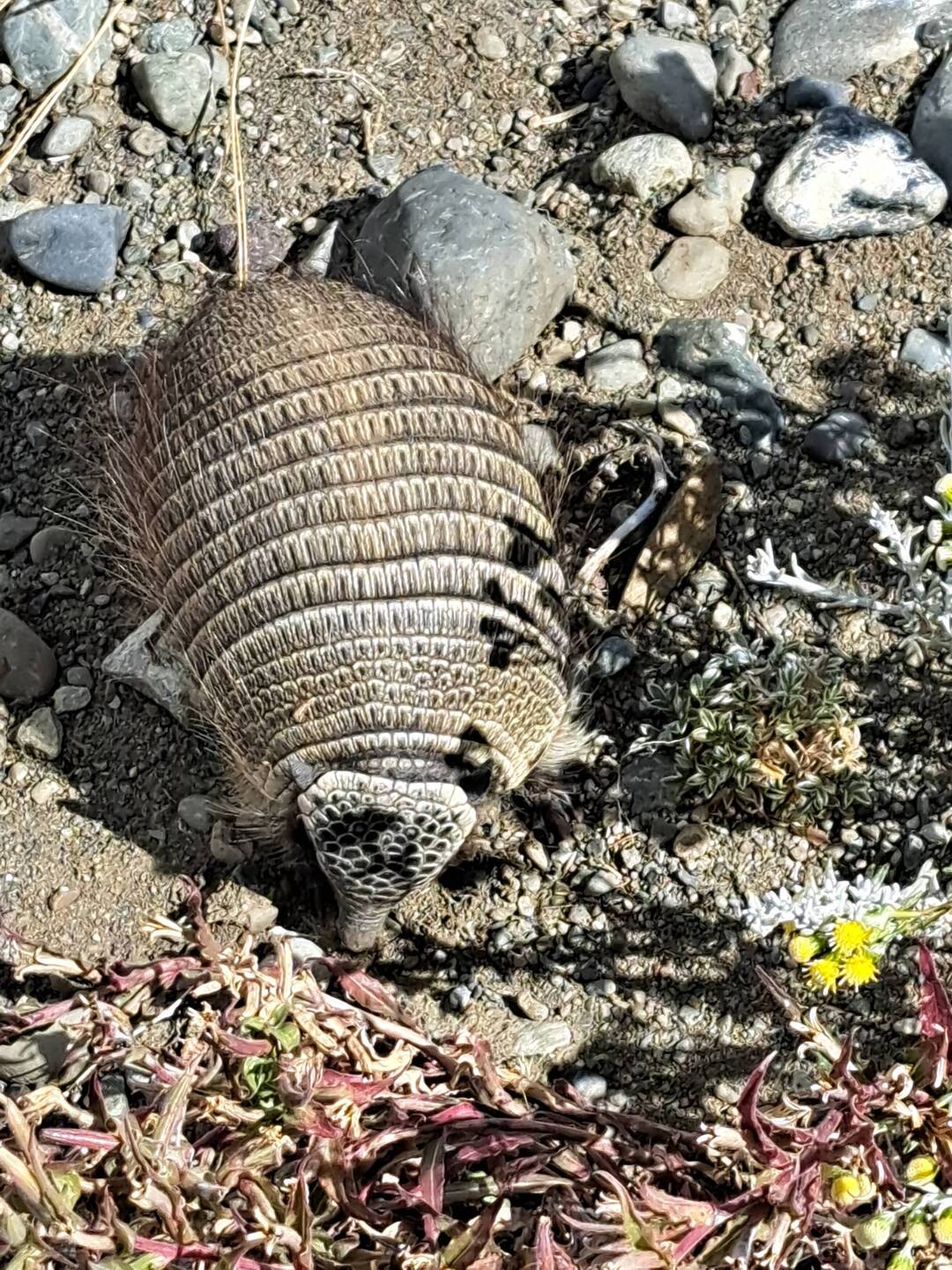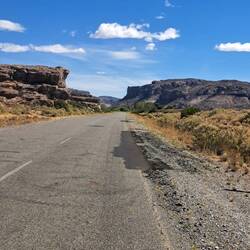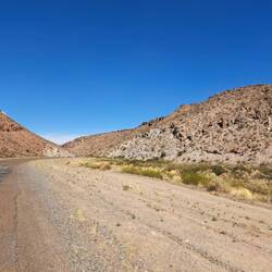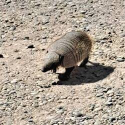 Die Sonne schien und es wird wärmer. Dieser Tag war trocken aber sehr windig. Und heftige Böen wehen über den Campingplatz. Und das war die Herausforderung. Die richtigen Zeitpunkte zu finden um das Zelt zusammen zu packen. Und alleine war es ein Geduldspiel. Für den äußeren Betrachter sicherlich belustigend für den Hauptakteur anstrengend. Nicht schön aber effektiv war dann alles verpackt und verzurrt. Nochmal ein Blick zurück auf die Berge und voraus sieht man Staubfahnen über die Straße wirbeln. Ein Gürteltier läuft über die Straße, es mausert sich unbeeindruckt meiner Gegenwart zum Poser.