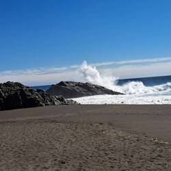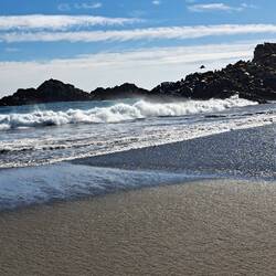 Kaum im Urlaub und schon wieder unterwegs. Ich werde eingeladen nach Cobquecura mitzufahren. Eine fast zweistündige Fahrt nordwärts zur Küste. Neues Fahrgefühl als Mitfahrer im Auto dabei zu sein. Die steinerne Kirche, Iglesia de Piedra, ist eine Felsenhöhle direkt am Meer. Bei diesem Wetter herrlich anzuschauen. Hoch schlagen die Wellen. Es kann vorkommen, dass das Meer die Höhle unter Wasser setzt. Dabei ist ein junges Paar ertrunken.