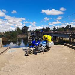 Die Nacht ist unruhig obwohl alles ruhig und still ist. Und wenn der Zeitpunkt kommt an dem man aufstehen will dann kommt nochmal die Müdigkeit. Auch OK. Der Tag beginnt sonnig und die Sonne bleibt unser Begleiter. Einige Hunde leisten uns beim Frühstück Gesellschaft. Über die Ruta 5, eine zweispurige Straße geht es gemütlich Richtung Norden. Die Straße ist belebt aber wenig spannend. Nur ein Van-Fahrer fährt mit uns gleichauf, hupt und winkt freundlich. Vorbei an Eisenbahnbrücken und, halt Moment, eine Brücke ohne Mittelteil. Die ideale Kulisse für ein Fotoshooting. Etwas versteckt die Zufahrt und ziemlich blöd wenn man sich hier hinlegt oder sich festsetzt. Vorsichtig und ein bißchen Schwung und Blue erklimmt die Brücke. Etwas Spannung muß sein. Findet wahrscheinlich auch der LKW-Fahrer der unser Shooting mit seiner Hupe akustisch unterstützt. Wir fahren zwischenzeitlich ab von der "Autobahn" um etwas Sightseeing in Talca, Curico und San Fernando zu machen. Hier am Fuße der Berge sind die Weinanbaugebiete. Auch der Wein des Jahres 2021 stammt aus dieser Gegend. Ein ungewöhnliches Gefühl sich schon am früheren Nachmittag um eine Unterkunft zu bemühen. Santiago kann ein Tag warten. Rancagua vermeiden wir für eine Übernachtung. Vor einigen Tagen wurde hier ein Polizist getötet. Ich finde ein Campingplatz im Weinanbaugebiet. Wie sich später herausstellt übernachten hier auch Monteure. Ein großer Gemeinschaftsraum, Frühstück inklusive und ein Zimmer für 10000 Pesos. Superfreundlich und Blue steht save unterm Dach. Ringsherum Weinfelder und Berge im Blick. Glück gehabt. Morgen geht's weiter.Lue lisää