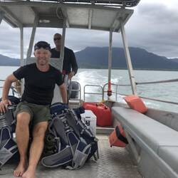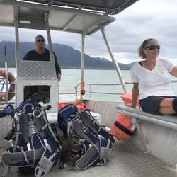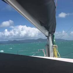 Langford reef is a narrow slice of sandy beach like a sand dune which sticks up just above the sea level in the middle of the ocean. Turtles feed off Langford Reef but today, visibility is poor and not great for snorkelling. The sail back to the mainland is rough as the wind has picked up past 25 nots. We sit on the Bow of the catamaran and get frequently splashed by sea spray and waves.Læs mere