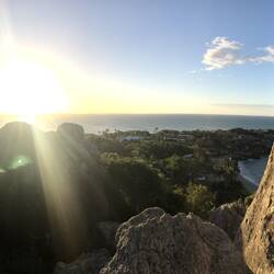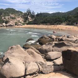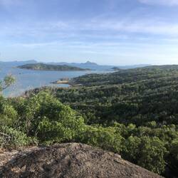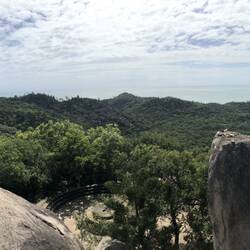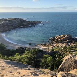 We reach the top of the lookout and view Chance Bay. A tall sculptured rock Island dominates the Far horizon.
