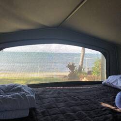 Once set up, I turn on the hiking stove and put the kettle on for a morning coffee and we unwind in the camping chairs with our his and hers beach towels, a gift from ‘R Kid”. This is the best view ever and look no further for paradise.