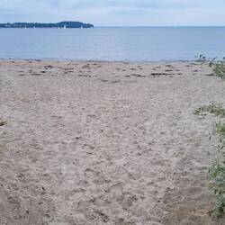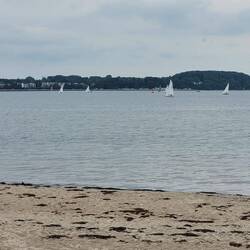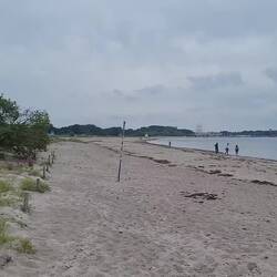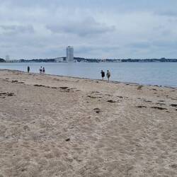 Das Maritim rückt immer näher. Es geht nochmal in den Wald. Dort steht noch ein letzter Wachturm rum. Es wirkt wie ein bisschen wie bei Rapunzel. Dahinter treffe ich wieder auf die Landstraße nach Priwall. Kurz davor dann ein Schild: Strandzugang! Ich folge dem Bohlenpfad und dann: Thalatta, thalatta, die Ostsee! Viel ist nicht los am Strand, auf dem Wasser schon mehr. Der Himmel ist grau, 20°, direkt am Ufer Algen. Trotzdem ziehe ich die Schuhe aus und gehe ins Wasser.