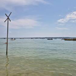 Wir haben heute eine Radtour gemacht, 73 km nach Cap Ferret und wieder zurück. Wir sind um 10 Uhr los, da war es noch erträglich. Es gibt hier rund um das Becken von Arcachon sehr viele gute Radwege. Wir sind heute größtenteils auf glatten asphaltierten Radwegen gefahren, einige waren auch holprig. Auf der Hinfahrt sind wir durch viele schattige Kiefernwälder gekommen. Cap Ferret liegt auf der Landzunge, die das Becken vom Meer trennt, gegenüber der Dune du Pilat. Wir waren bei der Seebrücke, aber da gab es nicht viel außer ein paar Restaurants. Wir sind zur Südspitze gefahren, um einen guten Blick auf die Düne zu bekommen und uns im Meer abzukühlen, aber dort war der Strand aus Schutzgründen gesperrt und nicht zugänglich. Wir sind dann zu einem anderen Strand auf der Becken-Seite gefahren, wo wir gebadet und unsere mitgebrachten Snacks gegessen haben. Danach haben wir uns suf den Heimweg gemacht. Inzwischen war es richtig warm, und wir hatten wenig Lust auf weitere Besichtigungen, deswegen haben wir den Leuchtturm ausgelassen, und auch die endlosen Strände auf der Seeseite. Vor uns lagen noch 35 km. Zurück sind wir eine andere Strecke gefahren, mehr durch Ortschaften. Wir hatten mehrere Trinkstopps, auf einem Campingplatz and der Strecke und im Netto Supermarkt kurz vor dem Ziel. War eine schöne Tour, die wir trotz Hitze gut geschafft haben. Zurück beim Campingplatz gab es dann eine Abkühlung im Pool. Abends gab es leichte Kost, Salat und Pellkartoffeln.