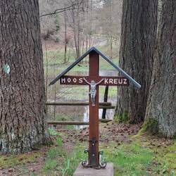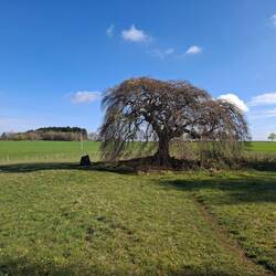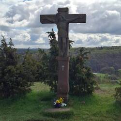 Los geht’s in Satzvey, gleich raus aus dem Ort, und wie’s der Teufel will, führt der Trail erst mal neben der Autobahn entlang. Der Lärm rauscht wie ein endloser Sturm, Motoren statt Wind – aber das gehört auch zum Ritt: nicht immer Freiheit pur, manchmal musst du den Dreck der Zivilisation fressen, bevor dich wieder das offene Land schluckt. Durch Wiesen führt der Weg, am Waldrand entlang, ein schattiger Laubenweg, dazu ein alter Kreuzweg aus Natursteinen. Er endet an einer Gedenkstätte für Kriegsopfer – still, ernst, schwer. Ich verweile einen Moment, ziehe den Hut, denke an all die, die hier ihre Spuren verloren haben. Der Trail erinnert dich daran: Freiheit ist nie selbstverständlich.