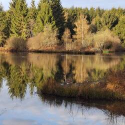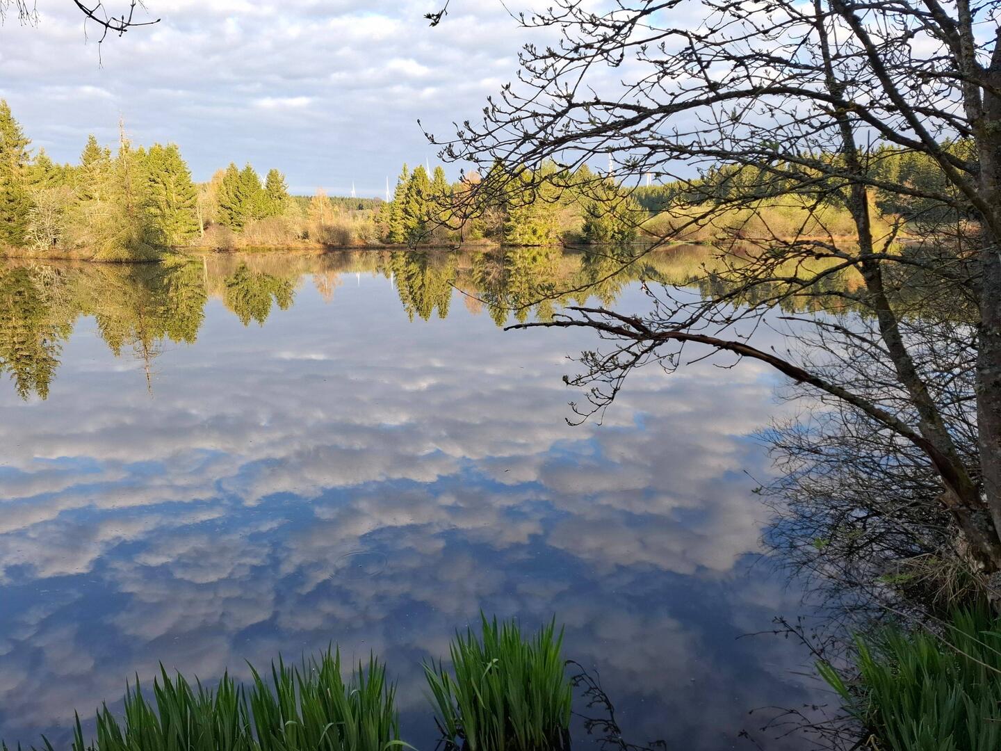 Die ersten Weiher tauchen auf wie kleine Spiegel mitten im Grün. Still liegen sie da, glatt und unbewegt, als würden sie alles beobachten, was hier vorbeikommt. Kein Laut, kein Mensch, nur Wasser und das leise Gefühl, dass man hier besser nichts stört. Ich halte kurz an, lasse den Blick übers Ufer ziehen und gehe weiter. Manche Orte verlangen keine Worte.