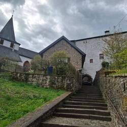 Hinter Golbach zieht der Weg in ein Tal, breit wie eine Schafsweide, immer leicht bergan, auf einem Fahrweg, der keinen Charme hat. Erst kurz vor Steinfelderheistert wird der Pfad wieder schmal, ein Wiesenweg, weich und ruhig, die Stiefel endlich wieder im Gras statt im Schotter. Und dann, endlich: Kloster Steinfeld. Die alten Mauern strahlen Würde aus, das Tor knarzt leise, und ich gönn mir meinen Lohn: einen Kaffee, ein Stück Käsekuchen, und als Souvenir ein paar Flaschen Klosterbier im Rucksack.