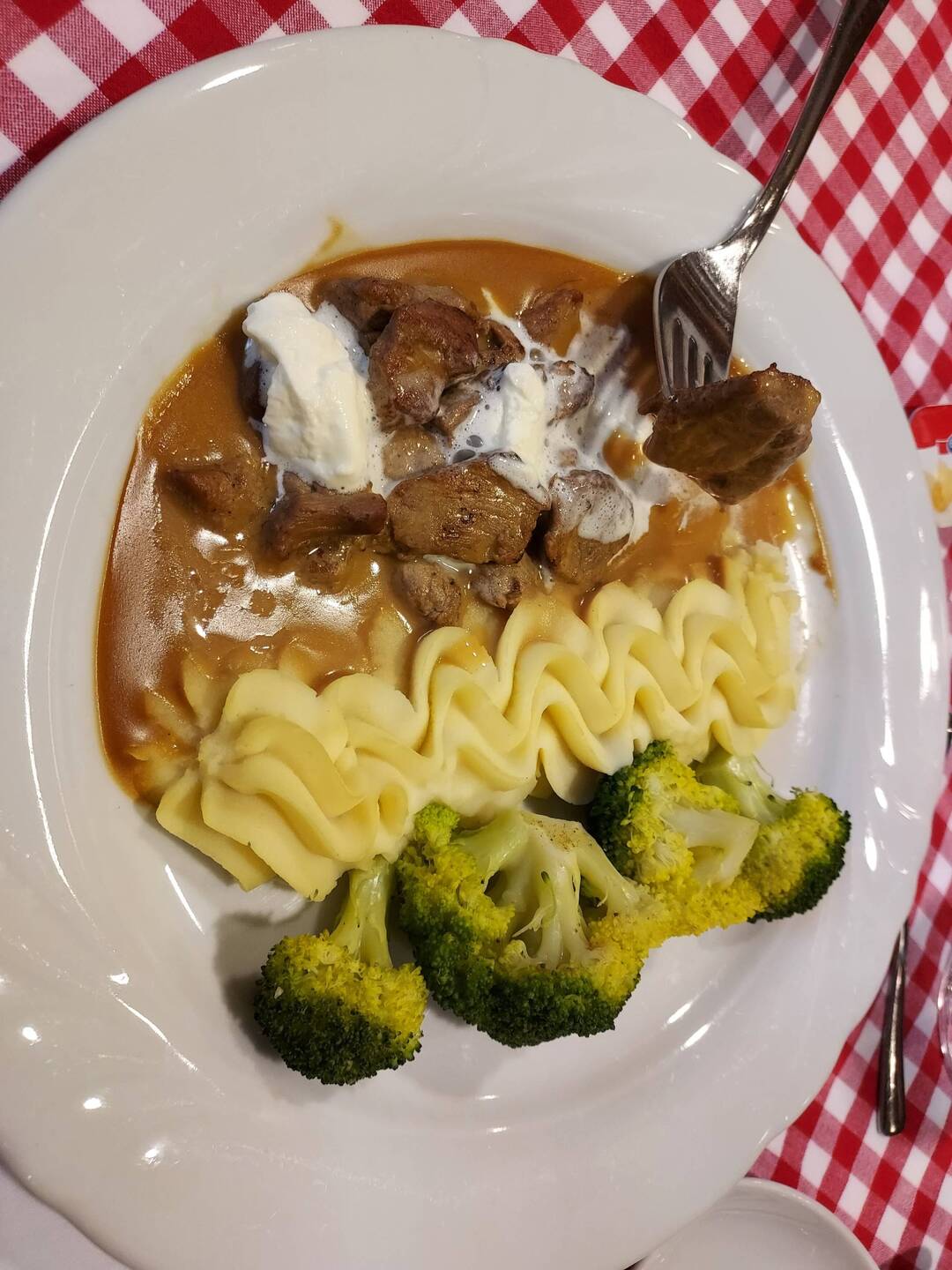 Veal (Zurich style), mashed potatoes, and broccoli for dinner. Ice cream with chocolate sauce for dessert.