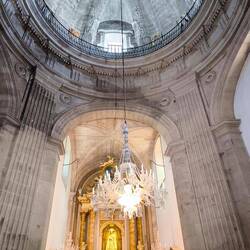 Wir bewundern die Kapelle des Allerheiligsten Sakraments mit einem vergoldeten Baldachin-Leuchter 🌟, der dem Weihrauchkessel ähnlich sieht. Eine prächtige Kuppel mit Tageslichteinstrahlung von oben, reiche barocke Dekoration mit Figuren und Säulen.