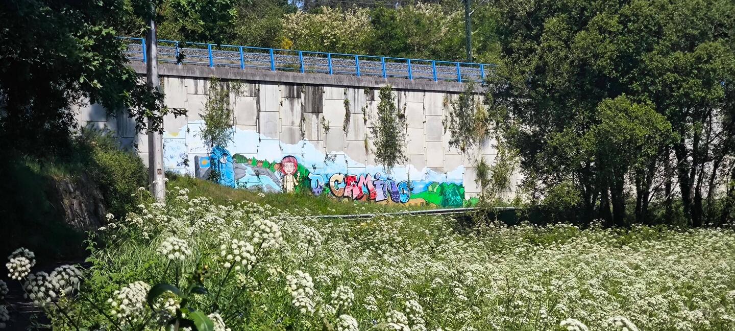 In "A Rocha Vella" 🏘️ an einer Wand mit Graffiti Kunst 🎨🖌️ vorbei.