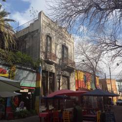In the early afternoon the skies had lightened a little, the rain had stopped and the sun even peeped out a couple of times. We decided to visit La Boca district. This district is one of the more seedy parts of Buenos Aires, but is popular among tourists for its brightly coloured buildings, mostly constructed out of corrugated iron sheeting. Apparently these were originally constructed by the fishermen of the city out of cast off materials.