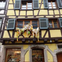 We had not walked for long before my mouth gaped open in wonder. In the dim lights from the windows this place really did look like a magical world. I had to admit that we had never seen anything like it and it even made the streets of old Colmar look plain by comparison. We did eventually find the restaurant and enjoyed a wonderful meal there with the locals. In this region many of the locals speak a special dialect called Alsation. It is related to German but is actually quite distinct. Sitting in this tiny restaurant gave us a chance to hear it spoken. We were the only English speakers in the place and we got the impression that very few visitors would come here after dark. It was a lovely night that we will never forget.