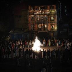 Après la première vague de singes, le pont subit la deuxième vague de chiens. Olivier, qui avait été pris de cours avec les singes, tente de s'extraire de ce corps mouvant mais ne peut lutter. Je le vois se faire renverser du pont et chuter la tête la première dans la Bagmati. L'horreur.