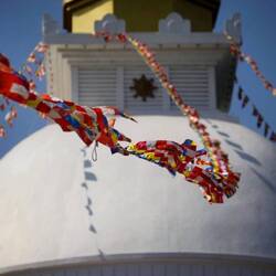 Sans soleil, c'est vraiment pas pareil. Le stupa est aussi majestueux, mais sous la pluie, la magie n'opère pas, ou beaucoup moins en tout cas. Le sol est détrempé, comme les bâches des boutiques autour du monument. Les couleurs que l'on voit ne sont plus celles des drapeaux flottant dans l'air et libérant les prières qui sont inscrites dessus. Aujourd'hui, ils sont collés entre eux et alourdis de pluie. Non. Les seules couleurs que l'on voit sont celles des parapluies des quelques visiteurs et moines qui tournent inlassablement autour du stupa en activant les moulins à prière.