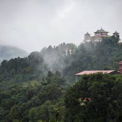 Le monastère de Kopan est magnifique. Il doit l'être tellement plus par beau temps ! Mais le ciel est bas, gris et sombre, et cette pluie n'en finit pas. Nous faisons un rapide tour des jardins et des bâtiments, puis nous nous rendons dans la grande salle de prière où une quarantaine de jeunes moines sont assis sur d'épais tapis de sol et semblent en plein examen, ou du moins travail écrit. D'autres moines plus âgés, probablement les enseignants, marchent dans les rangées, les surveillant et parfois les aidant.