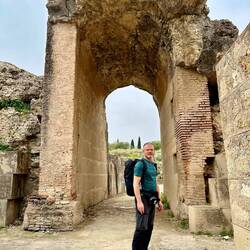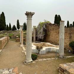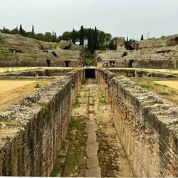 Vom Hostal ausgehend, wendeten wir uns dem Canal zu und gingen bis zu „Puente Isabel II“ - im Volksmund auch „Puente de Tirana“ genannt, weil sie das alte Stadtviertel „Tirana“ mit „Sevilla“ verband. Kurz hinter der Brücke hoben wir am Automaten etwas Geld ab. Wer weiß, ob wir in den nächsten Tagen in den kleineren Ortschaften elektronisch bezahlen können. Zunächst gingen wir ein kleines Stück durch dieses alte Stadtviertel. Man sah ihm das ehrwürdige Alter an. Die Fliesen an einem Keramik-Geschäft, waren sehr schön anzusehen. Vorbei an der Iglesia „Basílica del Stmo. Cristo de la Expiración“. In deren Torbogen befanden sich wundervolle Fliesen mit christlichen Abbildungen. Direkt dahinter folgten wir ein paar Stufen aufwärts und überquerten ein paar Straßen. An einem großen Parkplatz, wo an manchen Tagen auch Markt ist, gingen wir links über eine Brücke - wobei wir damit den „Rio Gualdalqivir“ überquerten. Gleich nach der Brücke ging es die Böschung hinab über einen Scherbenhaufen voller Fliesen - ein Schlaraffenland für Olaf 🤪 Ein herrlicher Geruch von Gülle erfüllte unsere Nase 😝 Wir folgten dem Weg entlang dem Fluss und auch die Luft wurde schnell besser. Hin und wieder überholten uns Fahrradfahrer. Am Wochenende fahren die Spanier gerne mit dem Drahtesel. Wir unterquerten zweimal die Autobahn und näherten uns „Santiponce“. Dort befand sich die bedeutende Ausgrabungsstätte „Italica“.