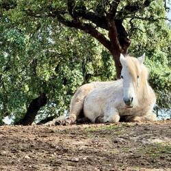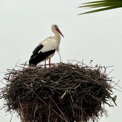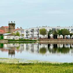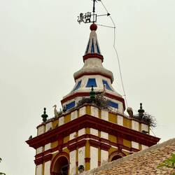 Wir folgten diesem Weg und kamen an einer Hausruine, einem Pferde- und Rindergestüt vorbei. Das Wetter heute war wieder diesig gewesen aber trotzdem mit ca. 28 Grad sehr warm und etwas drückend. Das bedeckte Wetter war aber gut, denn hätten wir pralle Sonne, hätten wir auf diesem kilometerlangen Abschnitt keinen Schatten gehabt. So ließ es sich jedoch sehr gut gehen. Wir erreichten nach knapp 22km „Guillena“ und entdeckten sogar einen Storch in seinem Nest. Dann gingen wir gleich zur Unterkunft „Albergue Luz del Camino (Herberge Licht des Weges)“. Diese hatten wir per Mail für das einzige Doppelzimmer für uns vorgebucht. Es stellte sich heraus, dass dies auch gut war. Denn die Herberge war ausgebucht. Auch das ist unglaublich. Denn die „Via de la Plata“ ist ein einsamer Pilgerweg. Die Hopitaliera erklärte und zeigte uns die Unterkunft. Nach einer kurzen Pause, reinigte ich meine Sachen und wir duschten. Danach gingen wir in den Ort, kauften etwas Wasser und gingen eine Pizza essen. Dann sahen wir nach dem Weg, der morgen durch einen kleinen Fluss verlief. Wenn diese viel Wasser führte, können wir nicht darüber und müssen etwas weiter entfernt die Brücke nehmen. Leider war dort etwas zu viel Wasser, was uns zwei ältere Männer auch erklärten. Er sei nicht passierbar. Nun gut. Jetzt wissen wir es und können morgen dann gleich zur Brücke gehen. In der Unterkunft zurück, holte ich meine Wäsche, die mittlerweile trocken war, von der Leine und alles war wieder sauber - so, als wäre ich nie in dem Schlamm ausgerutscht.