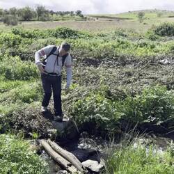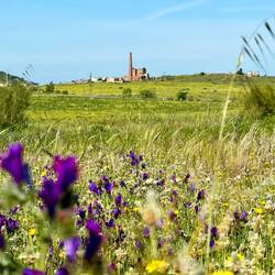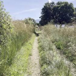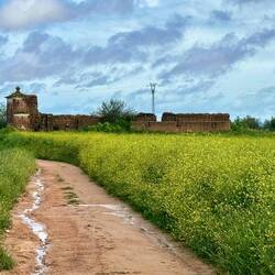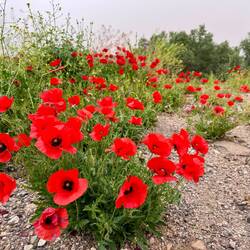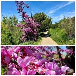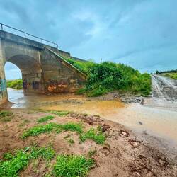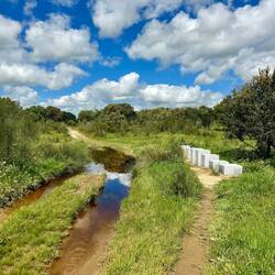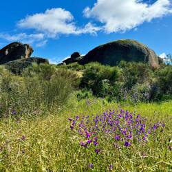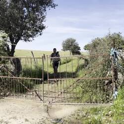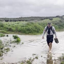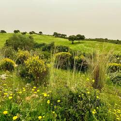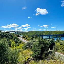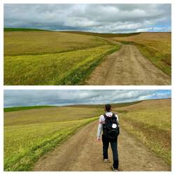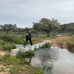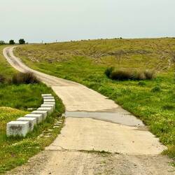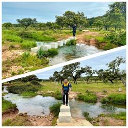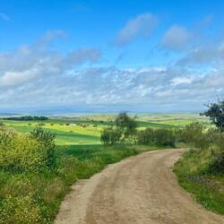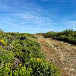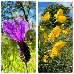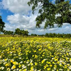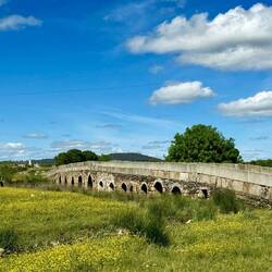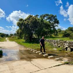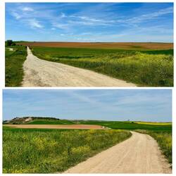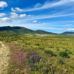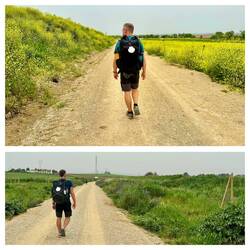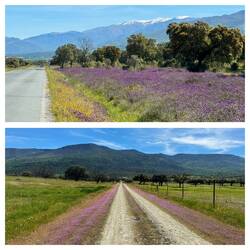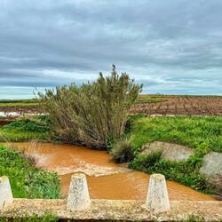 Nach dem Besuch von „Italica“, gingen wir zunächst an der Straße entlang. So langsam trocknete auch der restliche Schlamm an mir und bröckelte so langsam beim Gehen herunter. Vor uns ging eine ältere Pilgerin mit 3 (!) Jakobsmuscheln behängt und vor ihr eine jüngere Frau die eine Art großen Kinderwagen vor sich herschob. Darin saß auch tatsächlich ein Kind. Ich stellte mir schon vor, wie beide den Eisenträger über der Furt, welche in ca. 4km kam, überquerten - oder eigentlich ging da ja auch nicht. Aber eventuell bögen sie ja vorher noch ab. Nein, das taten sie nicht. Nach unzähligem überqueren von Straßen, kamen wir zum Abzweig nach „Guillena“ zu einer 7km schnurgeraden Schotterpiste. Fast genau in der Mitte des Weges war eben diese Furt und schon immer ein Grauen mancher Pilger:innen. Von meinen vorherigen Wanderungen her kannte ich diese Furt. Jedoch schien es eine neue Wegführung zu geben und so bogen wir dann auch rechts ein und folgten einer neu angelegten und neu ausgewiesene Schotterpiste für Pilger:innen und Fahrradfahrer:innen. Was uns sich auf diesem Weg rechts und links bot, war eine umwerfende Schönheit von blühenden Pflanzen in vielen Farben. Unglaublich.