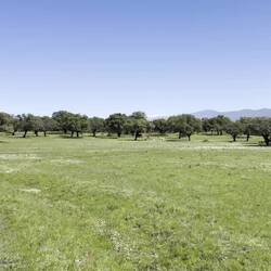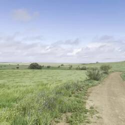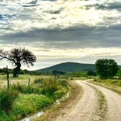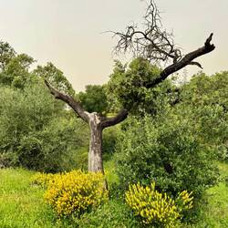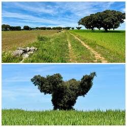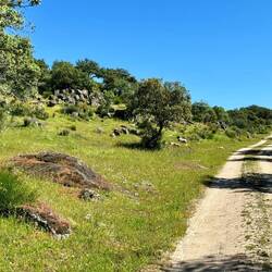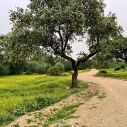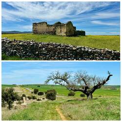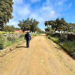 Zuerst ging es bergab durch einen bizarr mit Flechten bewachsen niedrigen Wald. Schattenlos - da keine Blätter. Wir erreichten eine einfache Landstraße, deren Verlauf wir folgten. Parallel von der Landstraße verlief ein kleiner Pfad. Allerdings war dieser hin und wieder stellenweise matschig und wir mussten dann auf die Landstraße ausweichen. Letztendlich blieben wir dann auf dieser und kamen in einer sehr großen Senke an dem Bauernhof des Landguts „Calzadilla del Mendigos“ vorbei.