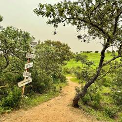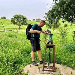 Aber auch die ließen wir alsbald hinter uns und Korkeichen begleiteten uns nun auf dem breiten Schotterweg. An einer Stelle stand ein Schild mit dem Wort „Wasser“ in verschiedenen Sprachen. Der kleine Trampelpfad führte uns durch ein Drehgatter zu einer Handpumpe. Die Pumpe funktionierte jedoch leider nicht mehr - bei meinen letzten Besuch vor etwas mehr als einem Jahr, förderte sie noch Wasser. Wieder zurück auf dem Weg, machten wir nach einer Weile eine kleine Pause.