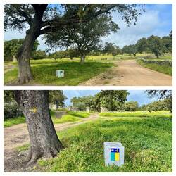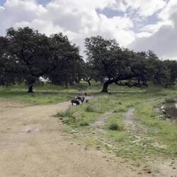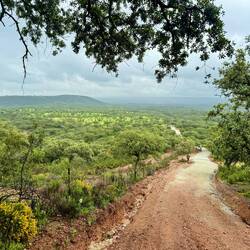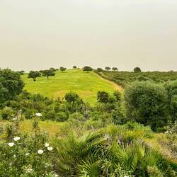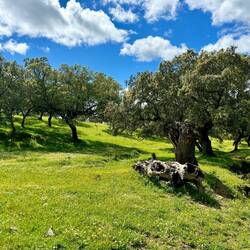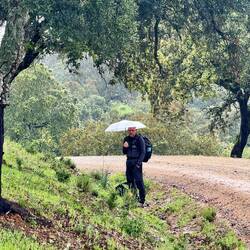 In der Nacht hat es heftig geregnet. Schon an den Vortagen haben wir die Regenfront in der Wetterapp kommen sehen und befürchtet, dass wir nicht verschont bleiben würden. Und so war es dann auch. Nach der guten Nacht habe wir zuerst überlegt, wo wir in dem Ort frühstücken möchten. Warum auch immer, kamen wir erst nicht auf die Idee, in dem Hotel, in dem wir genächtigt haben uns für die Etappe am Morgen zu stärken. Wir gingen mit unseren Rucksäcken in die Cafeteria von dem Hotel und bekamen Toast mit Tomate, Olivenöl, Kaffee und Orangensaft. Mehr wollten wir auch nicht. Der Tag hat also schon mal gut gestartet. Bliebe nur noch das Wetter. Es sollte sich zum Mittag hin beruhigen und weniger bis gar nicht mehr regnen. Aber so lange wollten wir auch nicht warten, denn heute hatten wir eine knapp 30km Etappe vor uns. Diese Strecke kenne ich schon von 2017 und 2023. Die Herausforderung war die Strecke von 16km auf der Straße entlang und wenn man schon erschöpft ist, darf man nach 25km noch einen Anstieg meistern. Jahrelange Versuche hier Abhilfe für die Pilger:innen zu schaffen, blieben bislang erfolglos. Manche Pilger:innen umgehen deshalb diese Strecke auf der Straße und nehmen sich ein Taxi bis zum Eingang des Naturparks „El Berroal“. Früher befand sich dort ein Landgut selbigen Namens. Das wurde jedoch von der Provinzregierung gekauft und dem östlich gelegen Naturparks „Sierra Norte de Seville“ angeschlossen. Die Natur und besonders die reiche Fauna des abgelegenes Parks sind weitgehend vom Tourismus unberührt geblieben und ein wahrer Genuss! Mit etwas Glück sei es wohl möglich, dass man Hirsche sehen konnte. Mal sehen ob wir Glück haben werden.