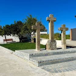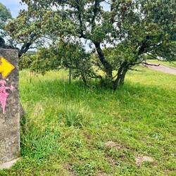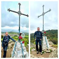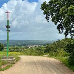 Danach kamen wir in einen Pinienwald und es roch wieder herrlich nach Pinien. Dann kamen wir an ein Eisentor und nach dem wir es passiert hatten, gingen wir auf einem grauen Schotterweg in Richtung des Bergrückens „Risco de Gallo“. Dieser Anstieg blieb mir von 2017 als sehr steil in Erinnerung. Aber 2023 war dieser steile Anstieg durch den zickzackartigen Verlauf des Weges abgemildert. Was jedoch noch geblieben ist, ist der auf einem Drittel des Aufstiegs stehende Gedenkstein in Erinnerung an einem 2016 dort verstorbenen Pilger. Kurz hielten wir hier inne. Weiter oben erreichten wir dann den Mirador „Cerro del Calvario“. Von hier aus bot sich uns eine unglaubliche Sicht in die umliegende Landschaft. Wunderbar.