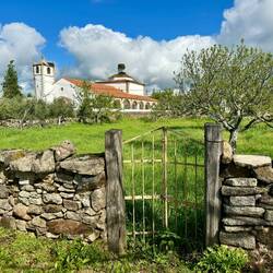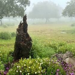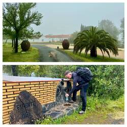 Nach der Pause gingen wir in den Park. Auch hier war es dunstig bis nebelig, was aber eine schöne. und mysteriöse Atmosphäre schaffte. Dann kamen uns zwei Autos von den Parkwächtern entgegen, die uns freundlich grüssten. Wir erreichten die Dienstgebäude des Parks „Casa Forestal“. An der Mauer gab es einen Zugang zu Trinkwasser und Olaf füllte seine Wasserflasche auf. Korkeichen begleiteten uns und wir gingen auf einem Schotterweg durch eine Busch- und Heidelandschaft und auch Zistrosen und üppiger Lavendel waren wieder dabei. Kleine graue Quader (Monolithen) aus Granit, wiesen uns durch eingemeißelte Jakobsmuscheln den Weg. An zwei Stellen mussten wir auf Steinquadern entlanglaufen, da der Weg von dem vielen Wasser überspült wurde. Kurz hinter der letzten überspülten kleinen Brücke, befanden sich die Ruinen eines alten Hospitals. Früher gab es sie am Verlauf der Jakobswege häufiger, um die geschunden Pilger:innen zu versorgen.