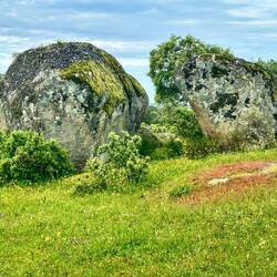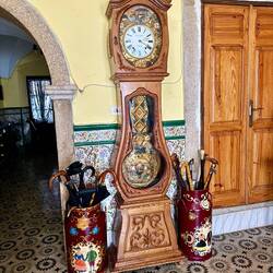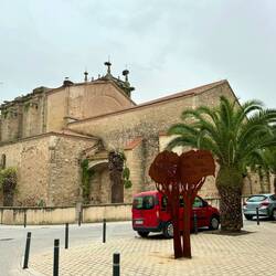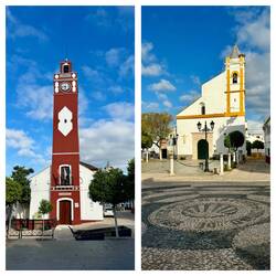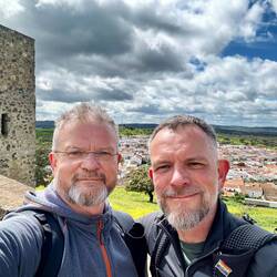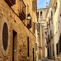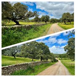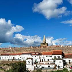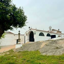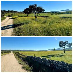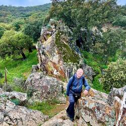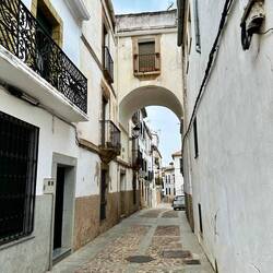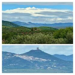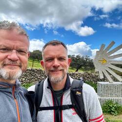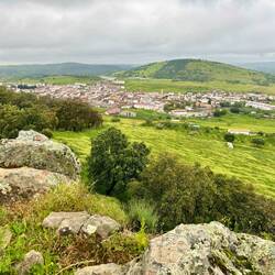 Danach gingen wir auf der anderen Seite des Bergrückens zu unserem heutigen Ziel „Almadén de la Plata. Erneut verließen wir kurz den Weg, um uns einen Felsen etwas genauer anzusehen. Etwas oberhalb von dem Ort befand sich auf einem begehbaren Felsen ein Kreuz „Cruz de la Paz“, was wir uns ansahen. Weiter abwärts gingen wir in die Stadt - welche uns sehr menschenleer erschien - und über eine schön gepflasterte Straße mit hübschen Mosaiken zu unserer Unterkunft Hotel „El Romeral“. An der Pforte eine Telefonnummer, die wir anriefen. Ein Mann meldete sich und er sei in 3 Minuten da - war er auch. Er nahm unsere Personalien auf und wir haben uns vorher im Eingangsbereich selbst die Pilgerstempel in unsere Ausweise gesetzt. Wir hielten uns nur kurz im Zimmer auf, denn es schien tatsächlich die Sonne. Das wollten wir noch ausnutzen und gingen durch den Ort. Auch um zu sehen, ob irgendwelche Restaurants geöffnet hatten und schauten uns das kirchenähnliche, hübsche rote Rathaus und die schöne, gelbe Kirche an. Auch auf dem Rathausturm und auf dem Kirchturm nisteten viele Störche - zauberhaft 🥰Letztendlich gingen wir in einen „Spar“ und kauften etwas Brot, Guacamole und Cola. Das nahmen wir auf dem Platz „Plaza de Reloj“ zu uns. Dann gingen wir in Richtung Unterkunft und ich wollte Olaf meine Unterkunft und Restaurant „Casa Concha“ zeigen, wo ich vor einem Jahr genächtigt hatte. Dort erfuhren wir aber auch, dass die Küche demnächst öffnet und es „Patatas brava“ gab. Darauf hat sich Olaf schon zwei Tage gefreut. Also blieben wir und aßen hier zu Abend - wir waren zufrieden mit dem Tag und zufrieden mit uns.