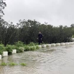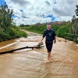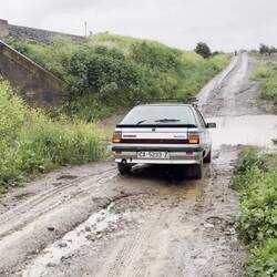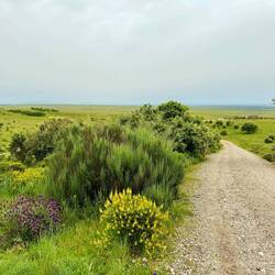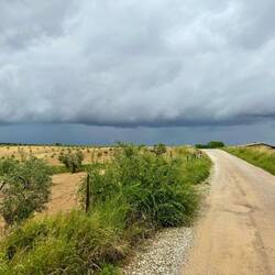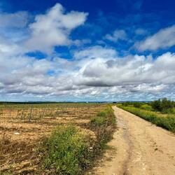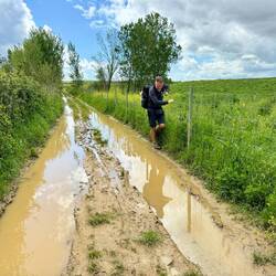 Eigentlich verlief ab hier die Route neben einer kaum befahrenen asphaltierten Straße entlang. Leider war die streckenweise überflutet, so dass wir ausschließlich dann auf dieser Straße gingen. Wir überquerten dann eine andere asphaltierte Straße und gingen dann neben zwei Häusern eine Sandpiste bergauf. Diese war leider auch etwas nass, aber es ging doch ganz gut. So langsam stellte sich bei uns nach knapp 28 km die Erschöpfung ein, zumal es recht warm war.