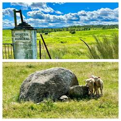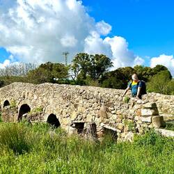 Es kam sogar eine flache, einfache Steinbrücke. Ohne diese wäre es ohne Schuhe ausziehen nicht weiter gegangen. Dahinter stieg der Feldweg leicht an und an einem schattigen Platz in der Nähe von einer Schweineweide, machten wir eine Pause. Die Sonne war schon sehr kräftig und wir cremten uns ein.