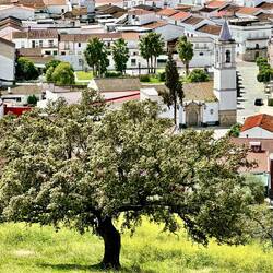 Wir durchschritten eine große Farm und auch hier war die Landschaft umwerfend schön. Wir sahen Zistrosen, Lavendel, Mohnblumen und andere herrliche Blüten. Die Vögel trillerten ihre wunderbaren Lieder. Schließlich erreichten wir die Autostraße, die nach „Castilblanco de los Arroyos“ führte. Direkt daneben führte der Pfad für uns weiter. Das ging so ca 2-3km und wir erreichten den Ort. Direkt am Ortseingang, befand sich unsere Unterkunft- das Hotel „Castillo Blanco“. Hier checkten wir ein und ruhten uns eine Weile aus. Gegen 17:30 Uhr gingen wir in den Ort, um etwas zu essen. Aber zuerst folgten wir den gelben Pfeilen (Jakobsweg), um zur Kirche zu gelangen. Leider war diese geschlossen. Aber auf dem schönen Kirchturm nisteten einige Störche, insgesamt fünf zählten wir. Dann gingen wir zum Ortszenteum und plötzlich sahen wir viele Menschen. Die standen in den Cafés oder Bars und redeten und redeten und redeten und viele waren chic und elegant gekleidet. Wir suchten 3(!) Bars oder Restaurants auf und wollten dort etwas essen. Aber in jeder Lokalität sagte man uns, dass geschlossen sei. Irgendwie wirkte das ganze Szenario in dem Ort so, als warte man auf Ereignis und deswegen auch alle Läden, Cafés und Bars schlossen. Möglicherweise wieder eine Prozession?