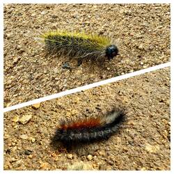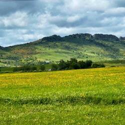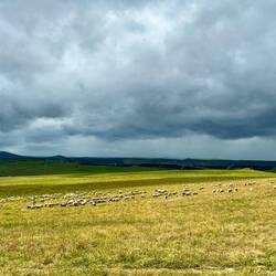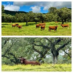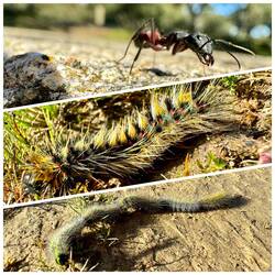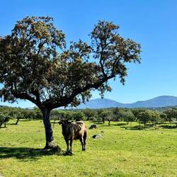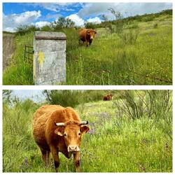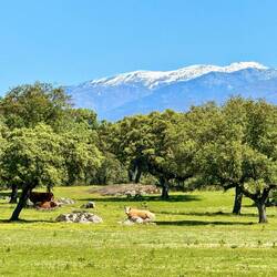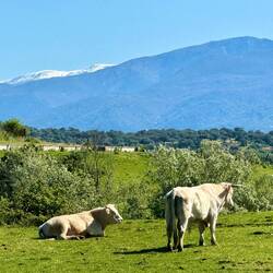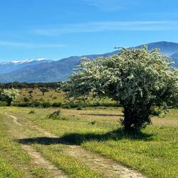 Weiter ginge es an Steineichen vorbei. Unterwegs sahen wir eine „Raupen-Prozession“ und daneben noch ein besonders haariges und prächtiges Raupenexemplar. Außerdem begegneten uns recht große Ameisen 🐜. Die Natur ist auf knapp 1000 m Höhe erst im Kommen und daher gab es wenig Schattenspender. Immer wieder kamen wir an weidende Rinder vorbei, die mehr oder weniger Interesse für uns zeigten. Olaf dafür um so mehr für sie. Es ging leicht auf und ab, über große Wiesen und wenn wir zurück sahen, waren die schneebedeckten Berge nun hinter uns. Lange waren sie immer vor uns und nun sind wir an ihnen vorbei.