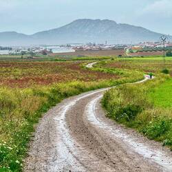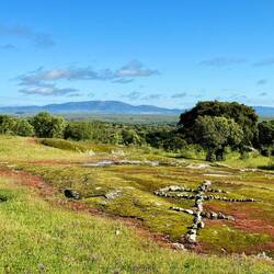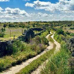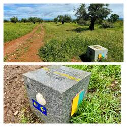 Der Weg führte über eine asphaltierte Straße hinweg und wurde zu einer gut begehbaren Sandpiste. Hier waren die „Cazadas romanas“ - Die großen, grob bearbeiteten, oft länglichen Steine weisen darauf hin, dass sie sich direkt auf der Römerstraße befinden, die sich über die umliegende Ebene erhebt. Die Römerstraßen waren wahre Meisterwerke des Straßenbaus.