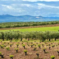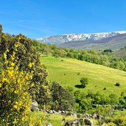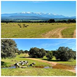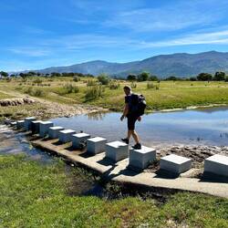 Es ging weiter durch die schöne Weidelandschaft auf einer Schotterpiste, die später in einen - immer noch gut begehbaren - Feldweg überging. Dann mussten wir über Trittsteine einen Bach überqueren. Auf einer Bank mit dem Blick auf die schneebedeckten Berge, mussten wir Sonnenschutzmittel auftragen und es war schon recht warm. Da kamen Tina und Alex mit ihren Fahrrädern. Sie werden natürlich vor uns in „Salamanca“ ankommen, aber wenn alles klappt, werden wir uns mit ihnen am Sonntag den 14.04. treffen. Dazu tauschten wir unsere Telefonnummern aus und sind gespannt, ob es klappt.