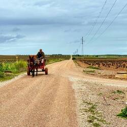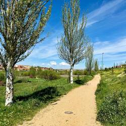 Es war Sonntag und einige spanische Radfahrende überholten uns grüßend. Wir brauchten dringend Schatten und auch eine Pause. Auf der Strecke gab es etwas abseits den Ort „Miranda de Azán“ und wohl auch ein Restaurant. Ein Hinweisschild auf unserem Weg bestätigte das auch - was nichts zu sagen hatte. Aber wir versuchten es und wurden nicht enttäuscht. Im Restaurant „Musicarta“ machen wir bei einer Cervesas im Schatten eine Pasue - herrlich. Danach wieder auf die Trockene und heiße Sandpiste bis zu einem Kreuz auf einer Anhöhe. Von hier aus sah man schon die nahe Stadt und die Autobahn, die wir unterquerten und wenig später eine andere Straße. Dahinter ein hübscher Park mit Pappeln und einem Trampelpfad. Eine kleine Anhöhe und durch einen kleinen Bahntunnel und wir waren in der Stadt angekommen. Es war gleich lauter und die Hitze wirkte intensiver.