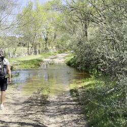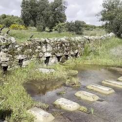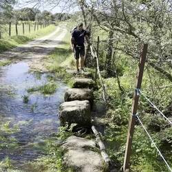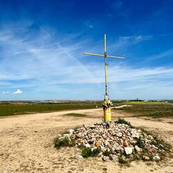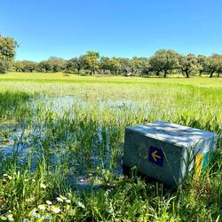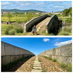 Alsbald verließen wir diese asphaltierte Straße und kamen über eine weite Wiese zu einem Feldweg. Der war sehr gut zu gehen und wir stellten uns vor, wie dieser Weg sich vor einer Woche begehen ließ. Immer wieder kam mal eine Furt, die wir über Trittsteine jedoch gut überqueren konnten. Ein großes Wegkreuz aus Holz, welches der Pfarrer Don Blas mit seiner Gemeinde aufgestellt hatten, ließen wir links liegen und gingen auf der leicht erhöhten Trasse weiter. Das ließ erahnen, dass wir hier tatsächlich auf der alten „Via de la Plata“ gingen und an mehreren römischen Meilensteinen vorbei kamen. Der Begriff „Vía de la Plata“ hat nichts mit dem Abbau oder dem Handel des Edelmetalls Silber zu tun, sondern kommt vom arabischen Bal'latta, dem Wort, mit dem die Muslime diese breite, gepflasterte öffentliche Straße mit festem Grundriss bezeichneten. Auf diesem Weg machten sie sich auf den Weg in den christlichen Norden. Es handelt sich um eine römische Straße namens „Vía de la Plata“, die Emerita Augusta (Mérida) mit Asturica Augusta (Astorga) verband.