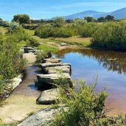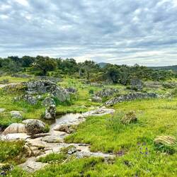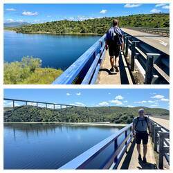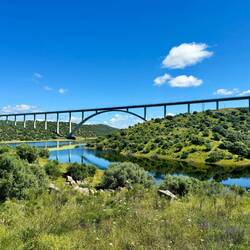 Auch heute wieder ein wundervoller schöner morgen mit angenehmer Temperatur, blauen Himmel und damit verbunden Sonnenschein. Wir gingen die alte Bahntrasse entlang und freuten uns über den herrlichen Tag mit den vielen tollen Gerüchen und Gezwitscher um uns herum. Es war fast niemand auf diesem Weg unterwegs - bis auf zwei Radfahrer:innen und drei Wander:innen. Immer mal wieder ein kleiner plätschernder Bach oder kleines Gefälle - herrlich und wunderschön. So kamen wir dann in „Hervás“ an. Hier wollten wir Wasser und Brot kaufen und auch etwas Geld abheben, denn bezahlen mit Karte, dürfte in den nächsten 3 Tagen in den kommenden Unterkünften/Bars eher nicht möglich sein.