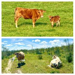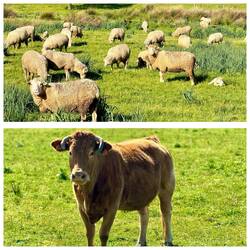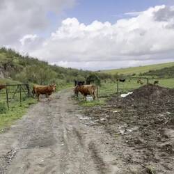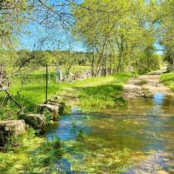 Es ging zuerst ein kurzes Stück auf einer asphaltierten Straße an einer steinernen Tränke vorbei. In einer Kehre war, zumindest am Anfang, ein recht matschiger Weg. Aber schnell wurde er trockener und gut begehbar. Es war wieder komplett blauer Himmel und die Temperaturen zu dieser Zeit (09:30 Uhr) angenehm. Es ging an Pappeln und - natürlich - Kühen vorbei. Sie zupften genüsslich das Grün mit ihren riesigen Lippen und kauten entspannt in ihrem Maul. Nach ca. 2,5 km überquerten wir auf einer kleinen Metallbrücke einen kleinen Bach.